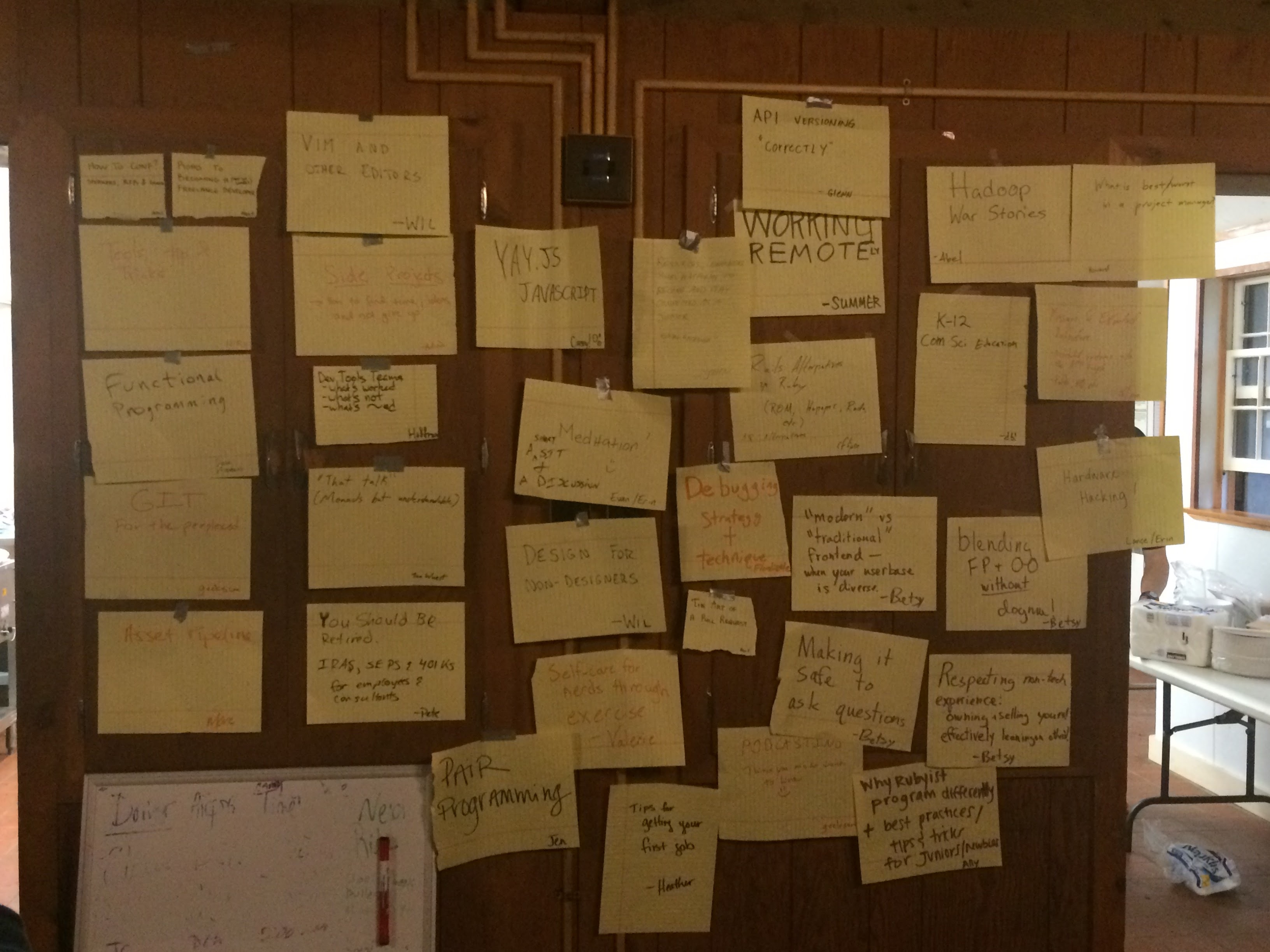 The sessions were fun icebreakers and some of us found ourselves leaning on our JavaScript expertise or other languages to accomplish the same goal. Breaks, lunch, and dinner split the pairing sessions and before you know it, day one has passed. Day two and three are centered around unconference talks. That means the attendees themselves lead 45 minute discussions around topics of their choosing. Topics are posted on the main wall of the cabin, and you can cast 3 votes for your favorite talks.